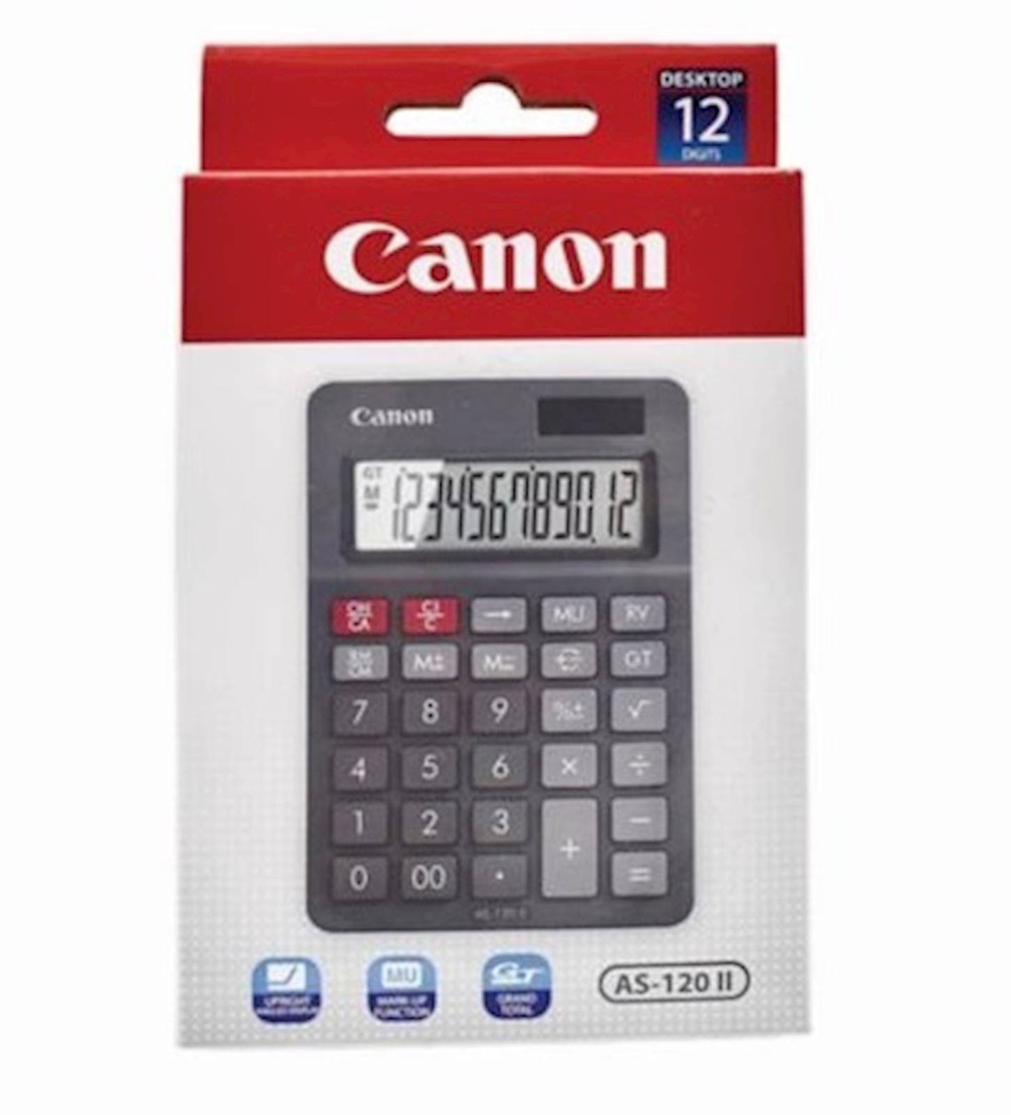 AS-120 II je stolni kalkulator s 12-znamenkastim uspravnim kutnim zaslonom. Također podržava funkcije označavanja i reverziranja. Impresivna funkcija memorije ukupnih zbrojeva znači da su vaši složeni izračuni olakšani spremanjem međuzbrojeva nakon svakog izračuna i izračunavanjem akumuliranih ukupnih zbrojeva jednim dodirom. Neki dijelovi kalkulatora AS-120 II proizvedeni su od recikliranog materijala tvrtke Canon.