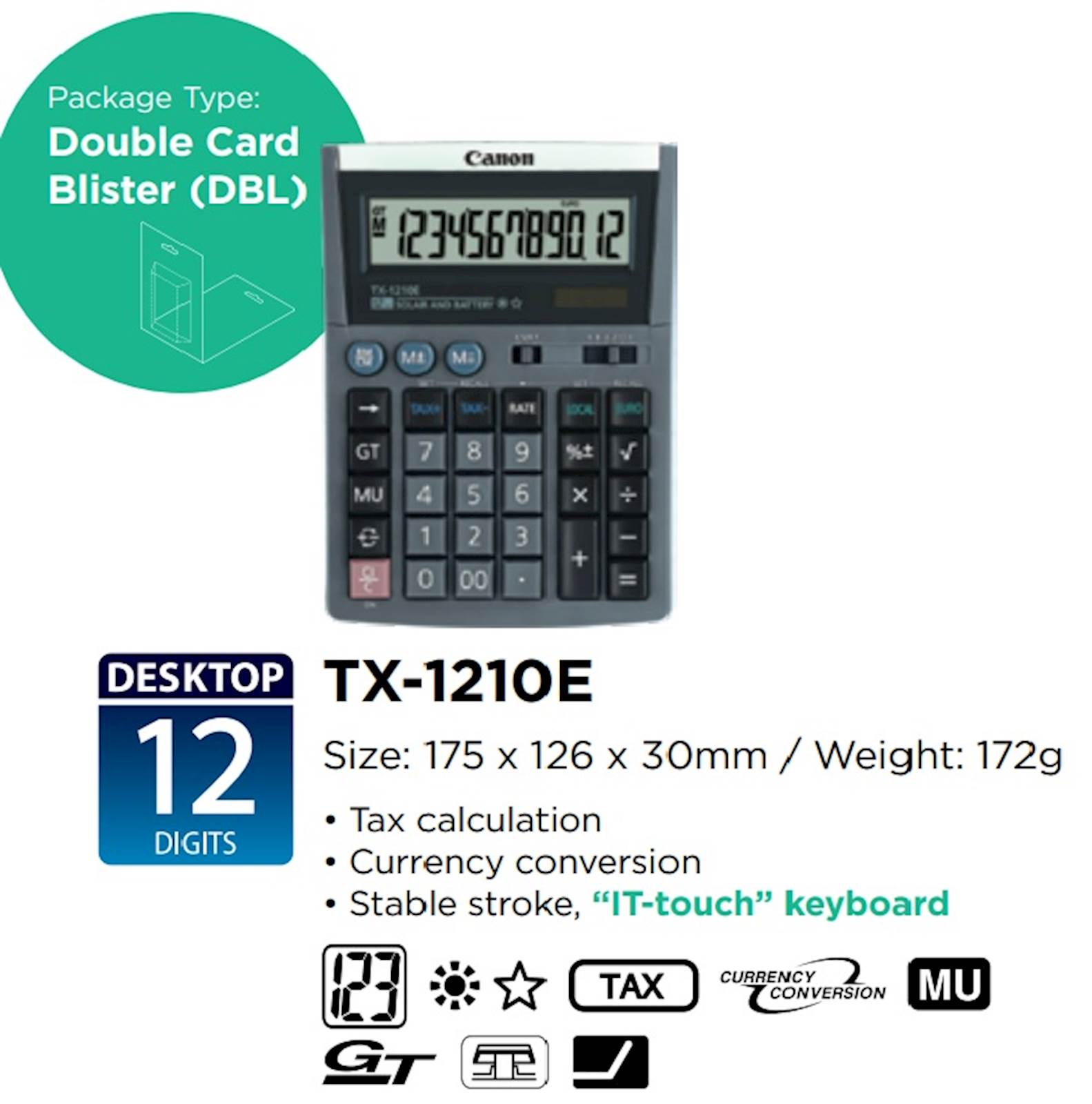 TX-1210E je 12-znamenkasti stolni kalkulator s velikim nagibnim zaslonom. Ima stabilnu tipkovnicu, euro konverter i funkciju izračuna poreza. Prednosti: • Euro-Local konverzija • Izračun poreza (TAX +, TAX-) • Velika, profesionalna, stabilna tipkovnica, slična tipkovnici računala za jednostavnu upotrebu • Velika i izdržljiva površina tipki s velikim oznakama na ključevima